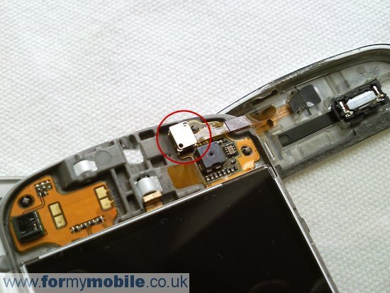 1. При падении, от удара, мог частично извлечься разъем шлейфа, который идет от лицевой панели и сенсорного экрана (тачскрина) телефона. Для проверки следует разобрать устройство (в мануале по разборке телефона Nokia n97 этот разъем обведен на фото красным кружком). Потяните разъем и отсоедините шлейф, потом снова вставьте разъем, соберите телефон и проверьте работу тачскрина.